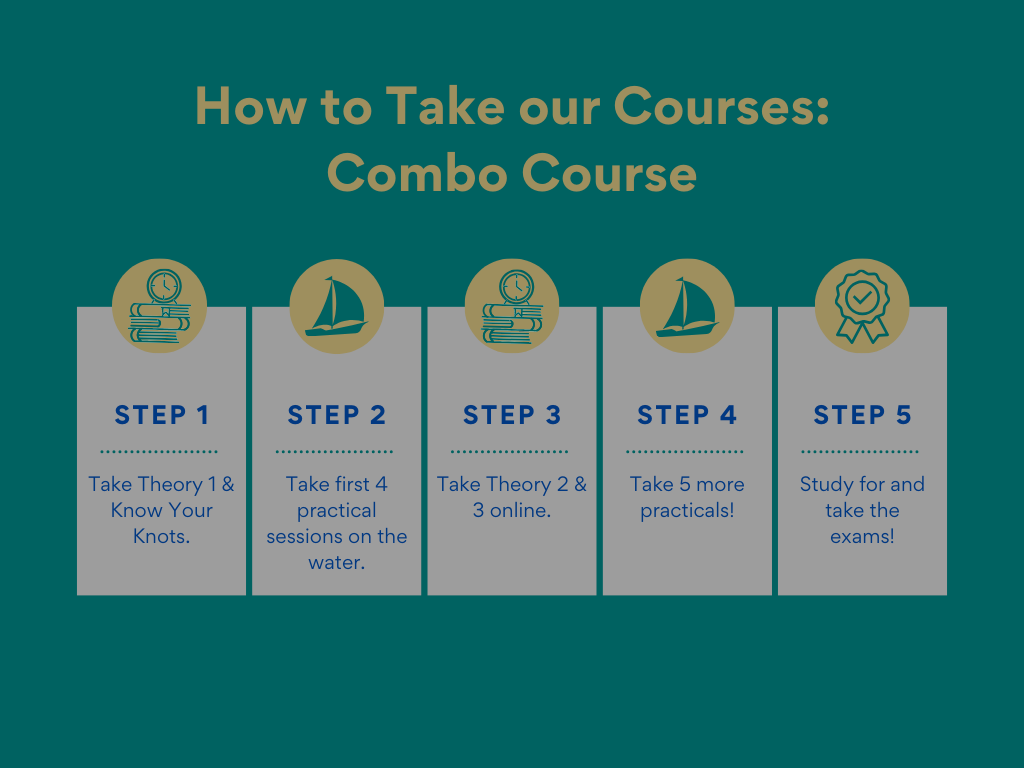 This combined course encompasses both ASA101 and ASA103. Students will get access to 3 online theory classes, a Know Your Knots class, and 9 on the water practicals (27 hours of sailing). This course is designed for the sailor who wishes to be able to Bareboat Charter (charter a boat without a professional skipper) in U.S. waters.